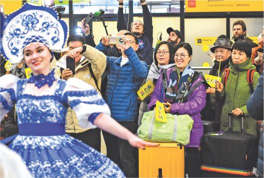 2月23日,在俄罗斯莫斯科的谢列梅捷沃机场,中国游客观看歌舞节目。当日,俄罗斯迎来中国试点恢复出境团队旅游业务后的首批中国旅游团。