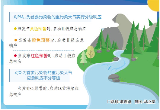 关于应急响应的分级,对PM2.5为首要污染物的重污染天气实行分级响应,对应预警分级,将应急响应分为三个等级,由低到高依次为Ⅲ级应急响应、Ⅱ级应急响应、Ⅰ级应急响应。当发布黄色预警时,启动Ⅲ级应急响应;当发布橙色预警时,启动Ⅱ级应急响应;当发布红色预警时,启动Ⅰ级应急响应。对O3为首要污染物的重污染天气应急响应不分等级。