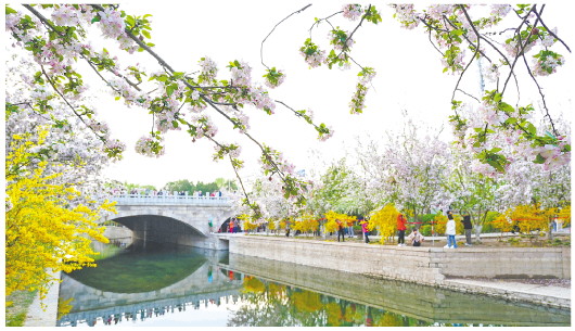 4月5日,人们在北京元大都城垣遗址公园赏花。(新华社记者 陈晔华 摄)