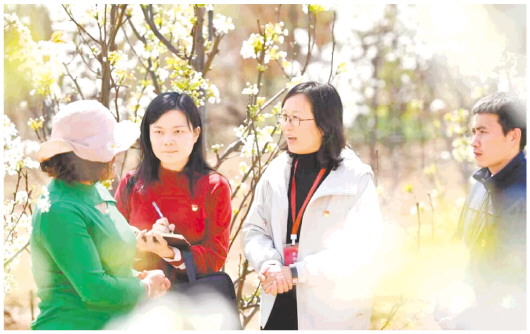 今年以来,郯城县纪委监委密切关注涉农惠农政策、资金落实情况,深入开展专项监督,组织纪检监察干部深入田间地头走访农户,着力查处涉农资金发放过程中存在的贪污私分、优亲厚友、截留克扣、挤占挪用等问题,守好乡村振兴“钱袋子”。图为3月30日,郯城县纪委监委工作人员在马头镇桑庄村向桃农了解上级惠农政策落实情况。