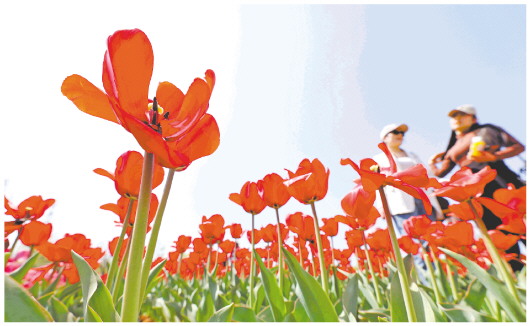 4月2日,游人在枣庄市市中区永安镇莲花山郁金香园游玩。春暖花开,阳光明媚。在莲花山郁金香园,盛开的郁金香沐浴在春光里,争奇斗艳,吸引众多游人前来踏青赏花,乐享春光。近年来,枣庄市通过推出多种赏花活动,以花为媒,聚集旅游人气,发展“赏花经济”,助力乡村振兴。