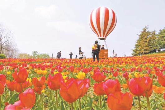 4月1日,泰山天颐湖第七届郁金香文化节开幕,多彩郁金香浪漫绽放,铺成一片缤纷花海。