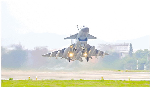 图为歼击机挂弹起飞(4月8日摄)。