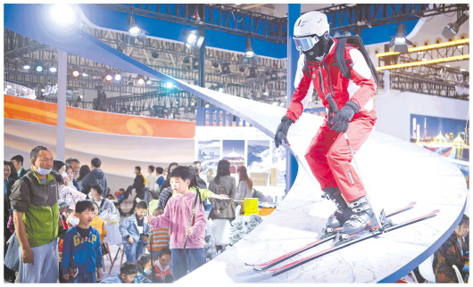 4月22日,观众在辽宁馆体验冰雪运动装备。