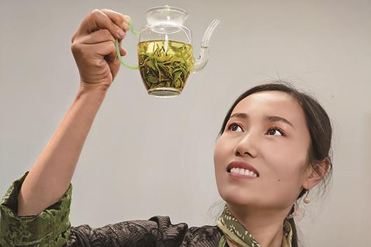 刘霞冲泡新炒制的春茶,仔细观察茶汤成色。