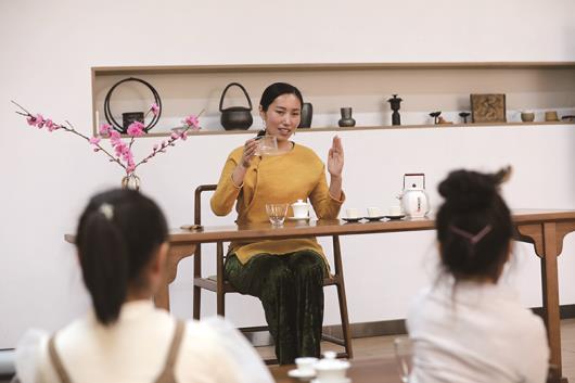 蒙山龙雾茶博园茶艺培训室,刘霞为前来参加研学活动的小学生进行茶艺培训。