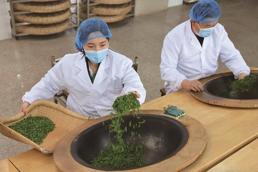 刘霞与公司生产部主任、拥有20多年炒茶经验的李建海(右)一起炒制春茶,学习炒茶技术。