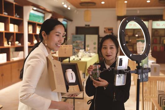 蒙山龙雾茶博园产品陈列室,刘霞(左)和同事一起做网络直播推销当地出产的茶叶。