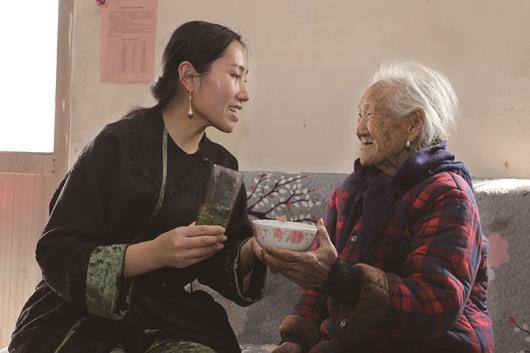院东头镇田家峪村,刘霞为张恒修送来新炒的春茶,102岁的张恒修是“沂蒙红嫂”祖秀莲唯一在世的女儿。