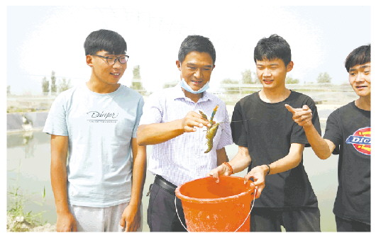 山东乡镇援疆干部臧运东(左二)成功在麦盖提县吐曼塔勒乡实现澳洲龙虾养殖,为当地群众开拓了新的致富路。