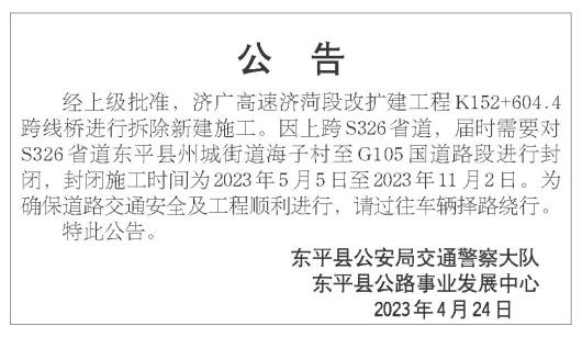 经上级批准,济广高速济菏段改扩建工程K152+ 604.4跨线桥进行拆除新建施工。因上跨S326 省道,届时需要对S326 省道东平县州城街道海子村至G 105国道路段进行封闭,封闭施工时间为2023年5月5日至2023年11月2日。为确保道路交通安全及工程顺利进行,请过往车辆择路绕行。
