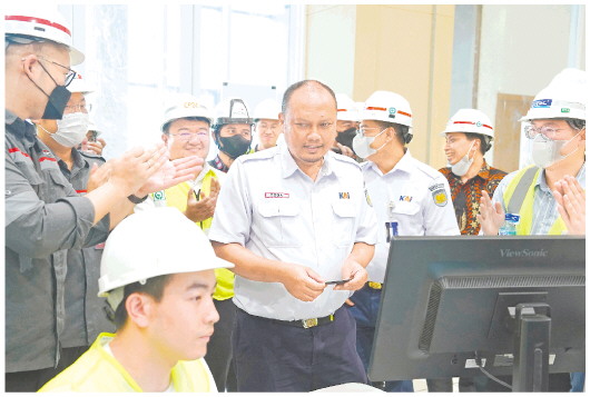 5月8日,在印度尼西亚万隆雅万高铁调度大厅,印尼中国高速铁路有限公司和印尼铁路公司工作人员一同见证雅万高铁首张客票样票打印。