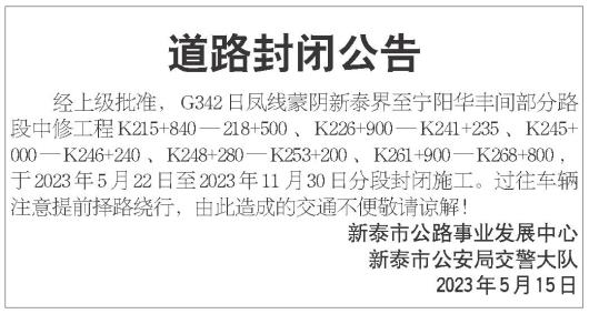 经上级批准,G342 日凤线蒙阴新泰界至宁阳华丰间部分路段中修工程K215+ 840—218+500、K226+ 900—K241+ 235、K245+ 000—K246+ 240、K248+ 280—K253+ 200、K261+ 900—K268+ 800,于2023年5月22日至2023年11月30日分段封闭施工。过往车辆注意提前择路绕行,由此造成的交通不便敬请谅解!