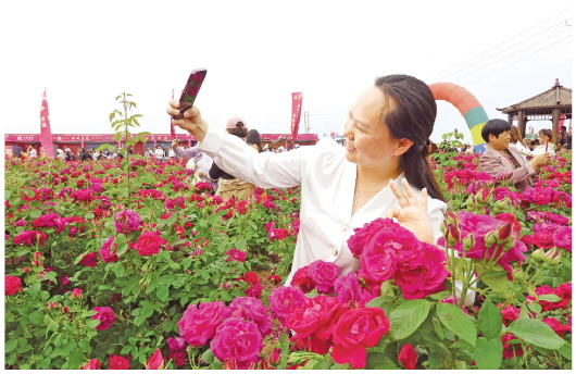 5月11日,游客在菏泽市定陶区万亩玫瑰园里打卡。当日,中国定陶第八届玫瑰风情节暨定陶文旅惠民消费季开启。定陶玫瑰种植历史悠久,黄店镇玫瑰种植面积1.26万亩,并获准注册“定陶玫瑰”国家地理标志证明商标,形成了集培育种植、加工销售、观光旅游等为一体的特色产业链条。