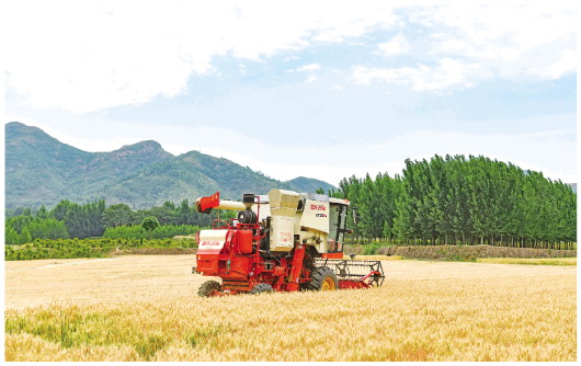 5月25日,邹平市青阳镇东窝陀村,联合收割机穿梭在山间麦田,隆隆机器声传递着丰收的喜悦。