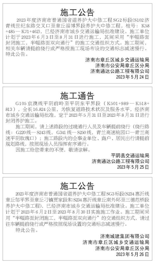 2023年度济南市普通国省道养护大中修工程SG2 标段(S102 济青线世纪东路交叉口至章丘淄博界段养护大中修工程,桩号:K58 +485—K71+ 462),已经济南市城乡交通运输局批准建设。施工单位计划于2023年6月3日至8月31日进行施工,其间采用“半幅路面封闭施工,半幅路面双向通行”的施工交通组织方式。施工期间,相关车辆请提前绕行或严格按施工现场布设的交通标志减速慢行。特此公告。