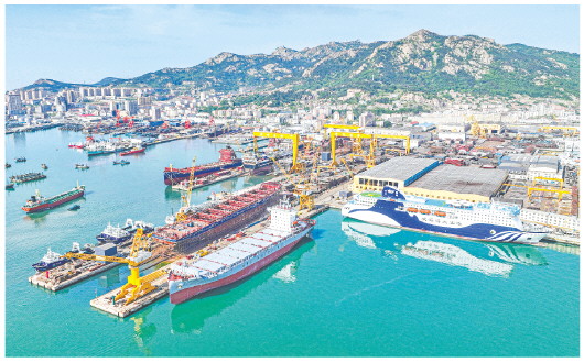 近日,在黄海造船有限公司的船坞内,工人们正在抓紧修建各类大型船舶。今年,该公司承接国外大型船舶建造订单达35艘,建造计划已排到2025年底。