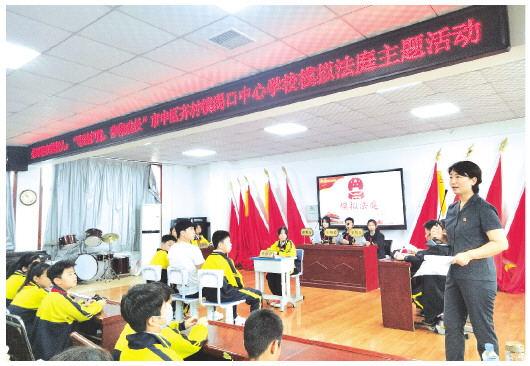 “现在开庭!”近日,随着清脆的法槌声,一场模拟庭审在枣庄市市中区齐村镇渴口中心学校拉开帷幕,100余名师生现场观摩。此次模拟庭审以一起未成年人抢劫案件为素材,10名学生分别扮演审判员、公诉人、辩护人、书记员等角色,体验刑事案件的庭审过程。枣庄市中级法院加强与学校的联动,采取送法进校园、模拟庭审、公众开放日等宣传活动,织密校园法治防护网,为青少年健康成长撑起一片“法治晴空”。