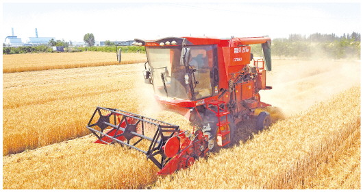 6月9日上午,孙耿街道济孙路南侧的大片麦地中,联合收割机正有序作业。