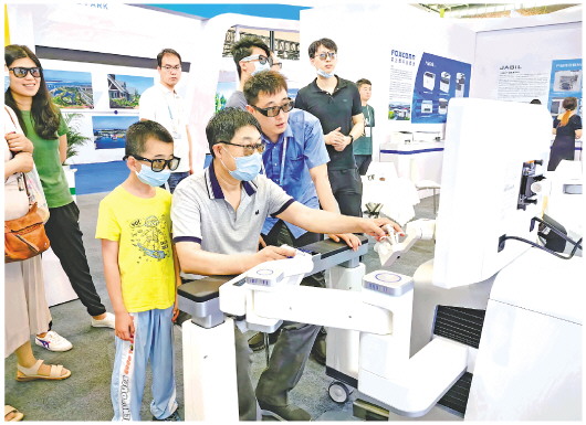 近日,精致城市·幸福生活博览会在威海国际经贸交流中心开展。本届博览会展览面积1.3万平方米,以“享精致 悦生活”为主题,紧紧围绕群众对美好生活的需求,集中展示智慧城市、科技制造、低碳生活、人居环境等领域的好品好物,充分体现“精致城市·幸福威海”的理念内涵和建设成果。170余家重点企业带着一系列新技术、新产品齐聚展会,共赴“精致之约”,共觅合作商机。图为观展市民在威海高新区展区模拟体验威高集团的手术机器人。