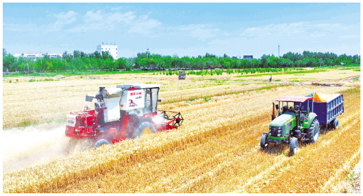 6月12日,在无棣县棣丰街道河沟村麦田里,无棣县荣超农机服务专业合作社的两台大型收割机正在作业。今年,无棣县小麦种植面积达64万亩,截至当日,全县小麦已收割过半。“三夏”期间,无棣县农机部门组织上阵小麦联合收割机以及玉米硬茬播种施肥机1000余台(套),确保小麦颗粒归仓和抢收抢种圆满完成。