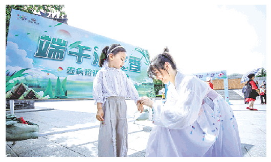 6月20日,南山旅游景区工作人员为小朋友系上五彩绳。