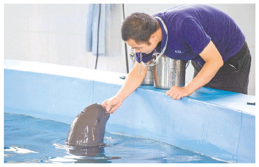 6月27日,中科院水生所白鱀豚馆饲养员给小江豚“F9C22”喂食。当日是中国科学院水生生物研究所白鱀豚馆人工饲养的小江豚(编号为F9C22)周岁生日,这是我国人工繁养的首头雌性二代江豚。