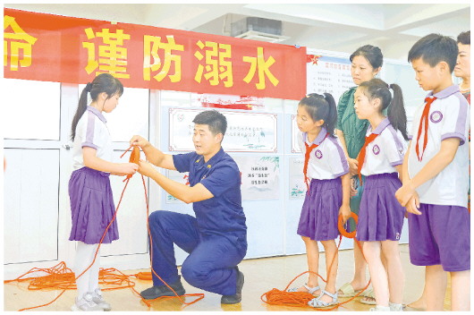 7月13日,青岛市李沧区东李社区新时代文明实践站,消防员正在教大家正确使用救生圈进行救援。当日,李沧消防救援大队李村消防救援站消防员走进东李社区新时代文明实践站,开展安全教育活动。通过消防员宣讲防溺水常识、教授安全急救技能,家长和孩子参与模拟救援等活动,增强家长和孩子们的安全意识和自救能力,筑牢暑假安全防线。
