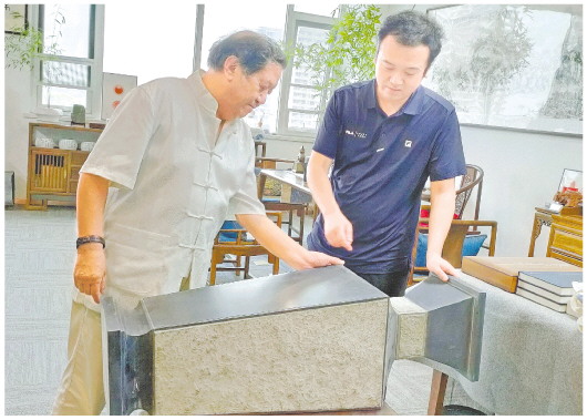“我的人生记忆是从国画、雕刻等跟制砚有关的东西开始的。”36岁的山东省工艺美术大师刘刚说,他的父亲刘克唐是中国工艺美术大师、我国制砚行业著名艺术家。受家庭氛围熏陶,在国外进修6年后,刘刚选择回国子承父业,他将国际设计理念与传统技艺结合,作品《徐公石琅琊刻石砚》曾获省内文学艺术最高奖“泰山文艺奖”。图为父子二人在切磋技艺。