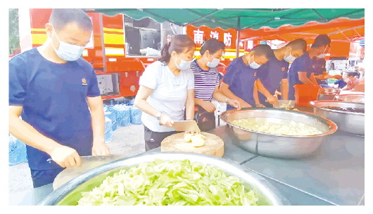 8月6日中午,涿州市民走上街头,帮助山东消防后勤保障支队准备午饭。
