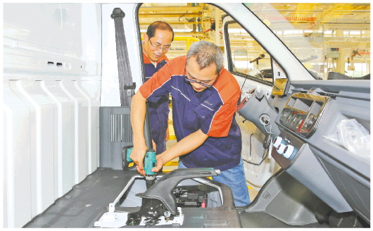 在位于淄博淄川经济开发区的山东吉利新能源商用车有限公司生产车间,来自山东水利技师学院交通工程系的专业教师正跟岗实践锻炼。