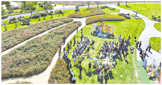 鱼台县积极推进文旅重点项目建设,在王鲁镇旧城海子景区规划建设嘟嘟鱼花园,成为鲁西南地区群众休闲娱乐消费的好去处。图为近日一对新人在嘟嘟鱼花园生态游乐区举办草坪婚礼。