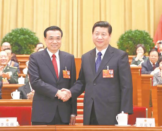 图①:2013年3月15日,第十二届全国人民代表大会第一次会议在北京人民大会堂举行第五次全体会议。会议经过投票表决,决定李克强为中华人民共和国国务院总理。这是习近平同志和李克强同志亲切握手。 新华社记者 兰红光 报道