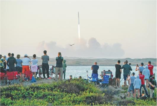 11月18日,在美国得克萨斯州南帕德里岛,人们观看“星舟”火箭发射。