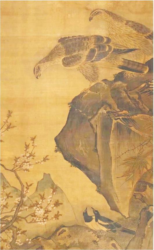 明代吕纪鹰石中堂图轴,孔子博物馆藏。绘双鹰双鹊相互对视,各怀其意,气氛凝重。周围再绘以山石、鲜竹、桃花相互映衬,烘托出春天的美好气息,巧妙地化解了图景中的紧张气氛,构思巧妙,匠心独运。绢本设色雅致,工写结合,既具法度,又富生气,使苍鹰与喜鹊之间的微妙气氛与山林环境的静谧形成对比,动静相生,让画面具有扣人心弦的感染力。