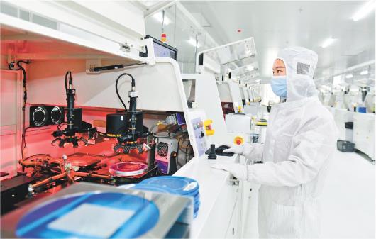 11月30日,在巨野县新一代信息技术产业园,工作人员在直显芯片生产设备前值守。