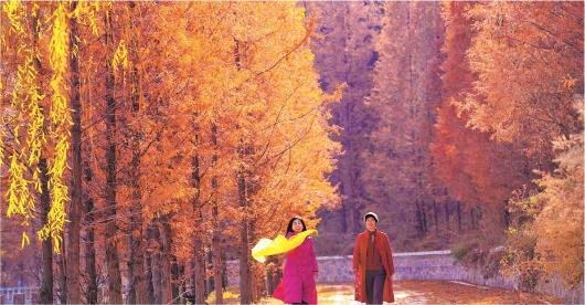 12月6日,邹平市西董街道樱花山景区颜公湖边的水杉和柳树在阳光的照射下,染上一层橙红和金黄,呈现一片暖色调,为冬日的樱花山增添了美丽的色彩,成为市民冬季打卡地。