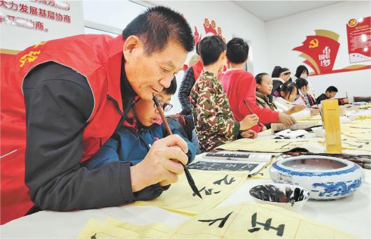 近日,在无棣县西小王镇小王庄村的新时代文明实践中心,退休干部志愿服务队的志愿者王乃义在指导小学生练习书法。