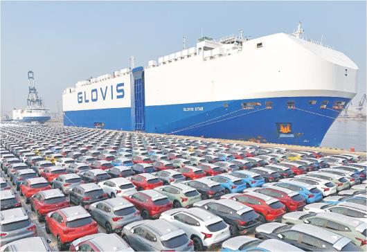 近日,汽车在山东港口烟台港集结等待装船出口。