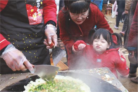 2024春节山东乡村文化旅游节枣庄启动仪式在滕州市西岗镇举行,一位小游客被当地传统小吃菜煎饼的香味吸引。(通讯员 王龙飞)