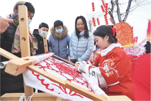 泰安市岱岳区,泰安大汶口花边技艺非遗传承人进行现场展示。(通讯员 陈阳)