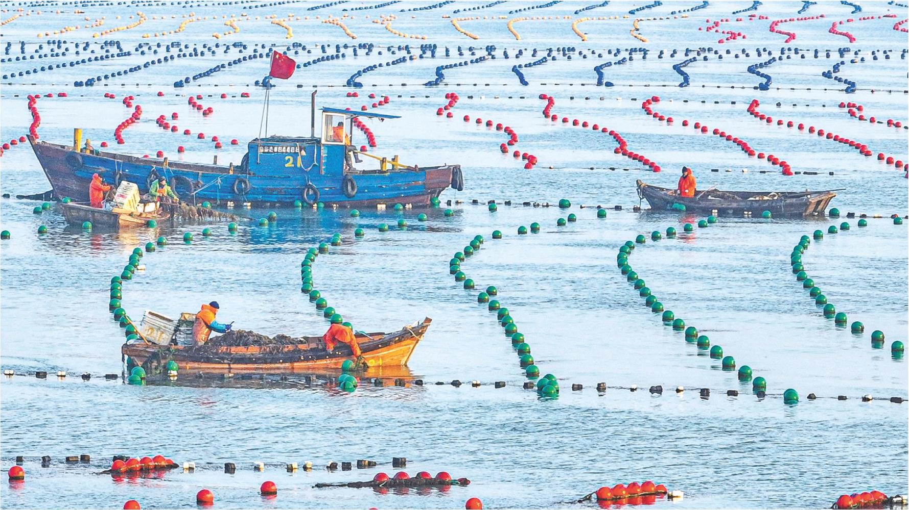 连日来,在荣成市俚岛镇的俚岛湾海洋牧场,养殖工人开展海带冬管、贝类养殖等各类海上生产作业,呈现出一派海上冬耕的繁忙景象。