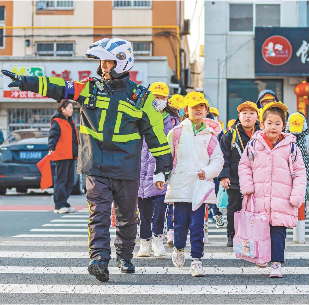 2月26日,在荣成市府新小学门前,交警为小学生们安全通行保驾护航。(□记者 陶相银 通讯员 李信君 报道)