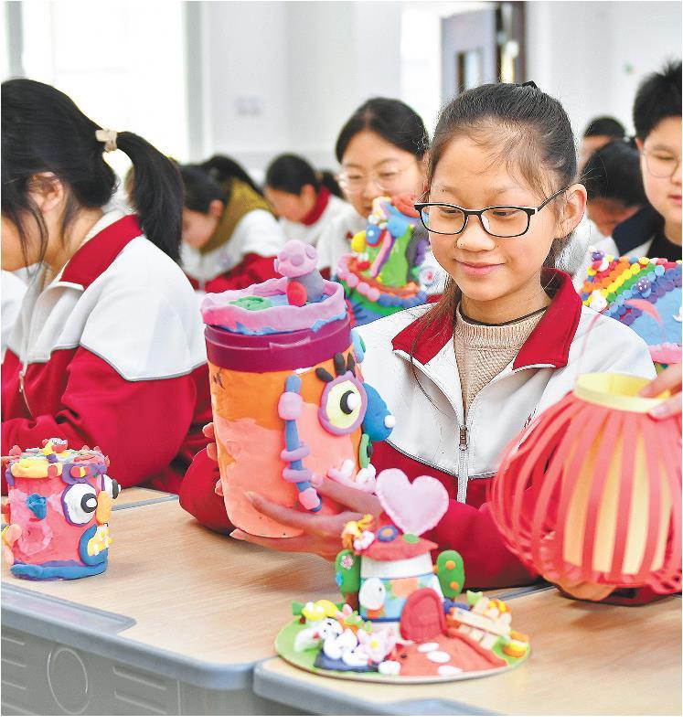 2月26日,在烟台市福山区芝阳山学校,学生在展示寒假期间制作的手工作品。(□新华社发)