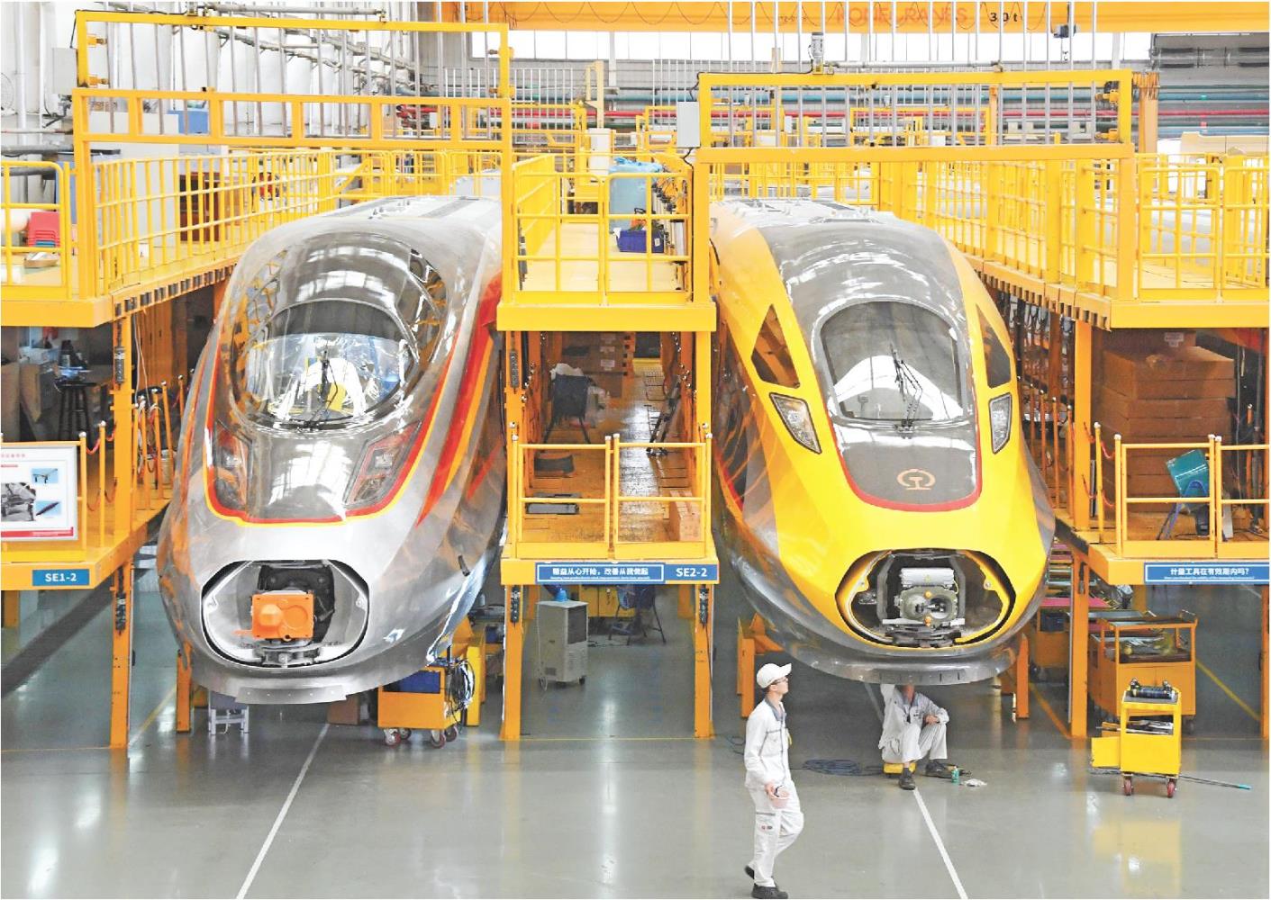 中车青岛四方总装车间工作人员在复兴号智能动车组生产线上进行装配作业。(□新华社发)