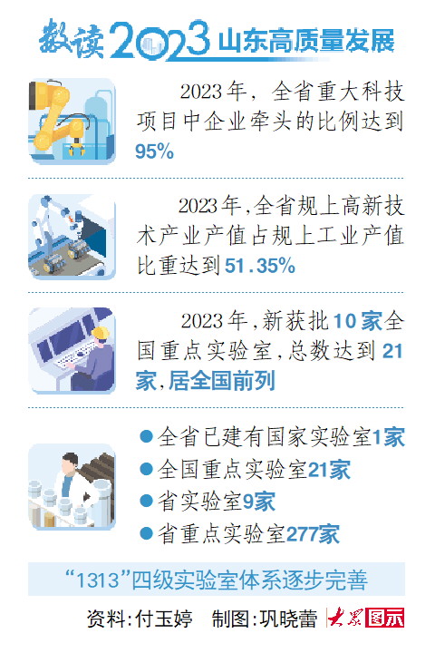 科技创新尤其是重大原创性、引领性创新,离不开攻关、制造、应用等全链条突围,高能级科技创新平台能很好地起到整合资源、加速赋能的作用。2023年,山东加快重塑基础研究平台,快速布局产业创新平台,全年新获批10家全国重点实验室,总数达到21家;新布局21家省技术创新中心,总数达到156家。这些“集中力量办大事”的平台,带动山东在超算互联、植物基因编辑等赛道取得一批标志性成果,在工业母机、碳纤维、合成橡胶等领域实现突破。