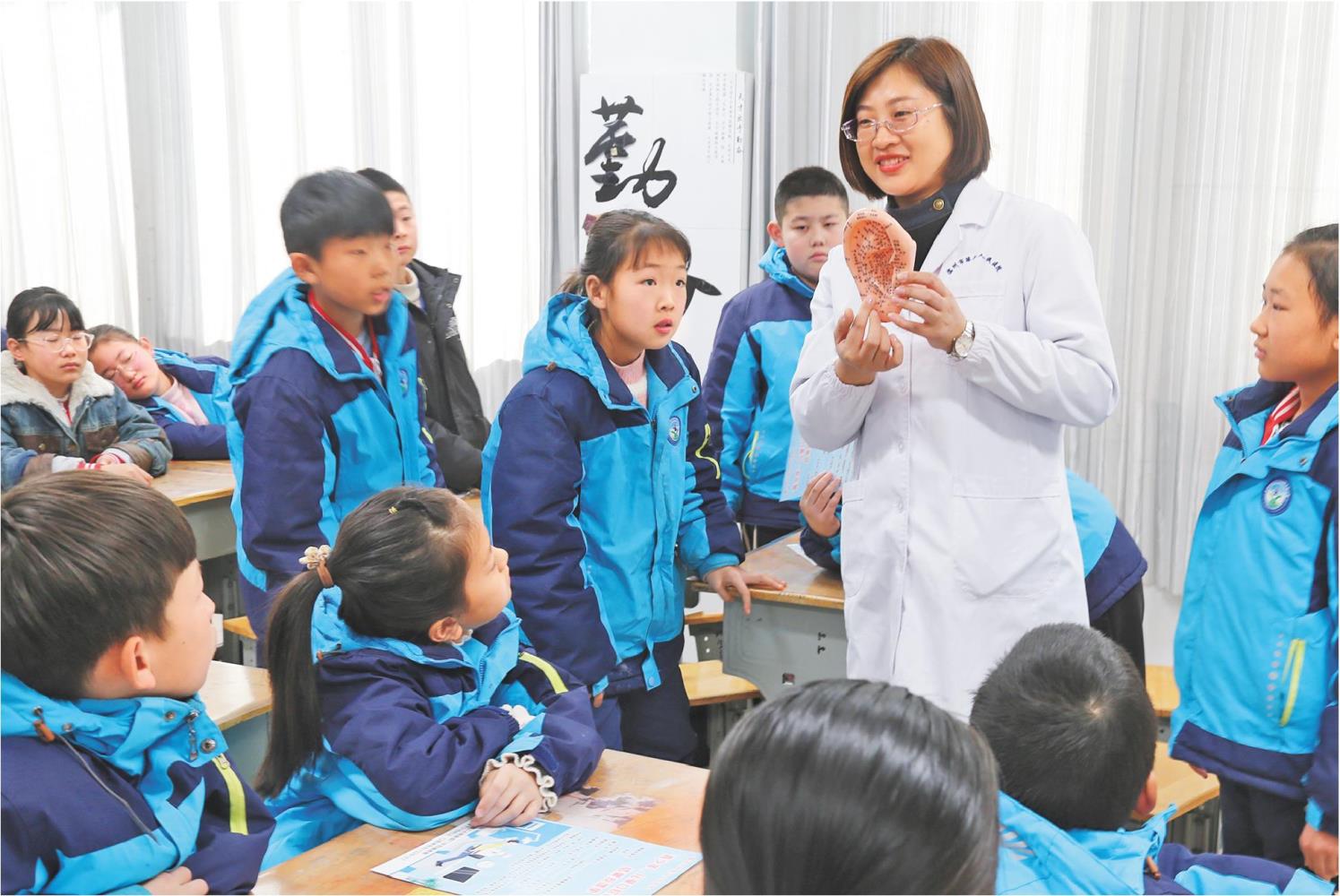 3月1日,在滨州市沾化区泊头镇实验学校,滨州市第二人民医院的医务人员正在给学生们讲解耳朵的结构和功能。(□新华社记者 贾海宁 报道)