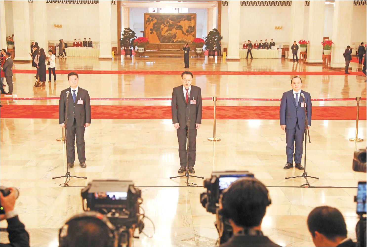 3月4日,全国政协十四届二次会议首场“委员通道”在北京人民大会堂一层中央大厅开启。全国政协委员韩保江(左起)、郭吉安、叶聪接受记者提问。