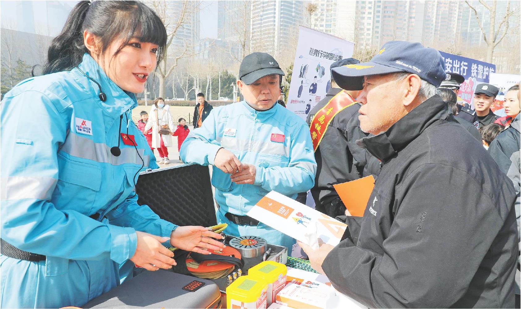 3月3日,共青团青岛市委联合青岛市公安局、市司法局等单位,在青岛五四广场启动“学雷锋”2024年青岛市周末志愿行动集中服务暨“守护银龄 志愿反诈”进社区示范活动。图为志愿者在为市民讲解安全救援知识。