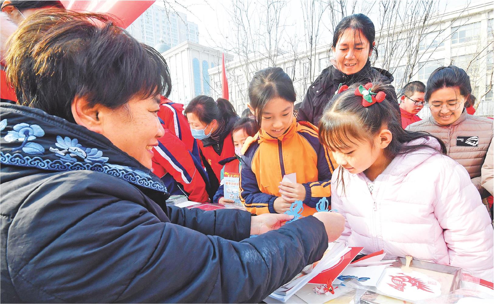 在沧湾公园活动现场,各志愿服务摊位干货满满,各类特色的“服务商品”,吸引了众多群众前来。志愿者们向群众提供义诊、普法宣传、应急救护、公益项目展示等志愿服务。图为剪纸手工艺人教孩子们剪纸。